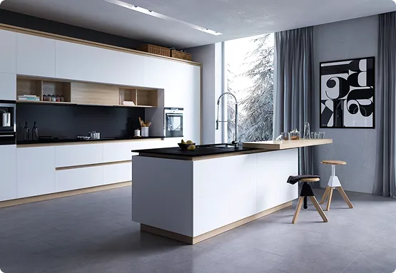 Входная зона офиса оформлена с тем же вниманием к деталям: стойка администратора из коллекции A4 встречает гостей и сотрудников, сохраняя общую стилистику интерьера. Для зоны ожидания мы подобрали модульные диваны Twingo — стильные, гибкие в расстановке, идеально подходящие для динамичного офиса. Кухонная зона и гардероб были реализованы как индивидуальные решения — по авторским эскизам, под конкретные размеры и запросы.